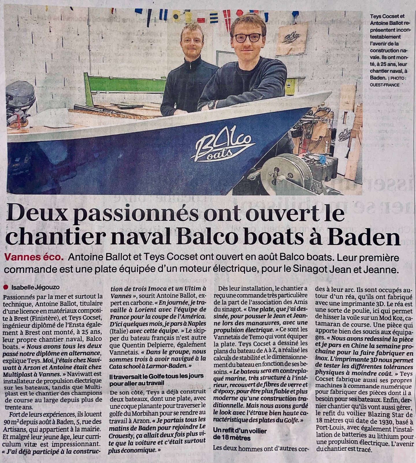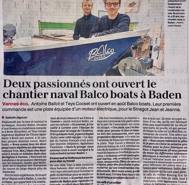 Nous avons récemment fait l’objet d’un article dans Ouest-France, mettant en lumière la création de notre chantier naval à Baden.
